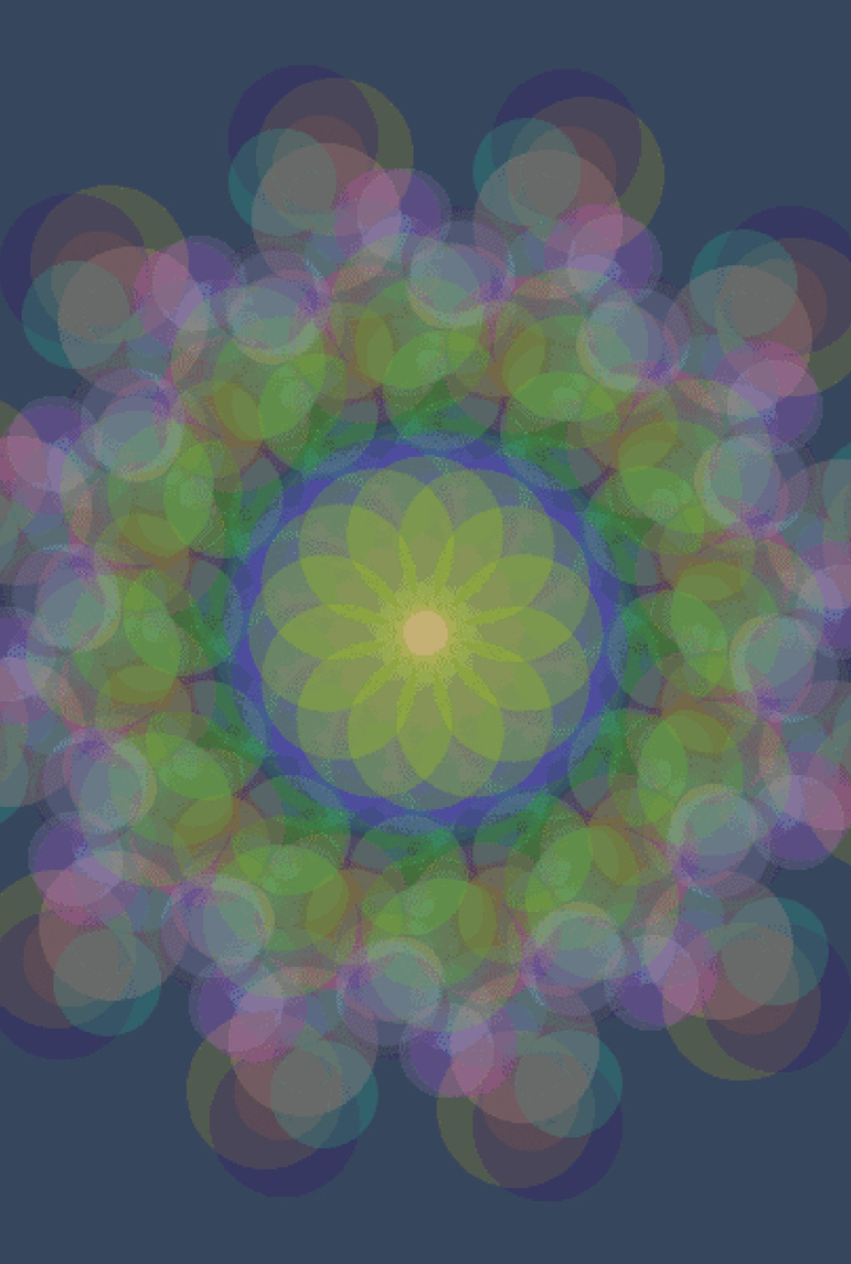 Usando aleatoriedade algorítmica, vários discos coloridos aparecem e somem, de acordo com uma simetria rotacional na ordem de treze, dando a aparência de um tipo de flor em eterno estado de desabrochar.