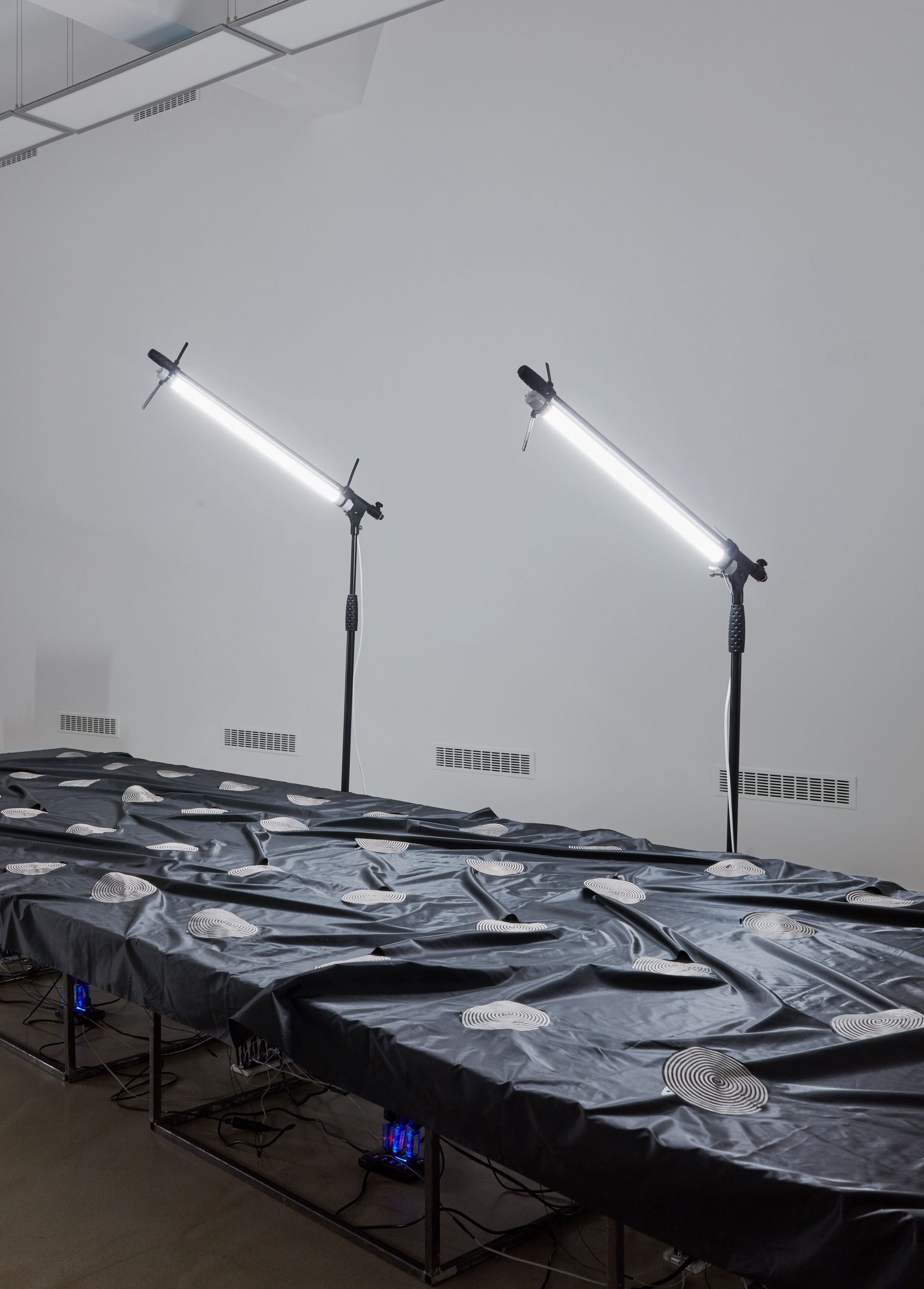 “Phase In, Phase Out” é um sistema sonoro têxtil multicanal que explora a materialidade do som. A exploração dessa experiência intermodal utiliza espaço, tempo, luz e som como componentes básicos e estruturas para abordar o efêmero aqui e agora. EJTECH explora as propriedades “alogogênicas” do som pelo timbre único do tecido, por meio de composições sonoras ou “poemas eletrônicos” especificamente escritos para e interpretados em um sistema sonoro puramente têxtil.