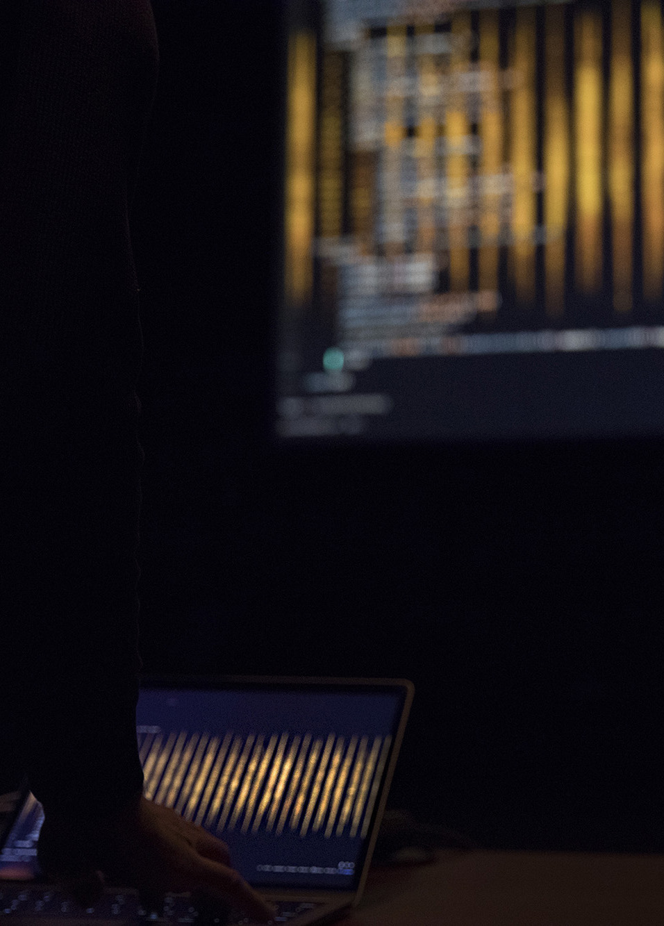 “Terraforms” é uma escultura imersiva codificada ao vivo que combina sínteses sonoras com gravações da natureza selvagem e fotografias algoritmicamente processadas. Conforme sons e fotografias da natureza selvagem são dinamicamente reestruturados e justapostos, o espectador é confrontado com a interação entre sistemas naturais e as consequências da refatoração deles por intervenção humana. “Terraforms” é desenhada para ser codificada ao vivo como performance ou para ser uma estrutura estática generativa.