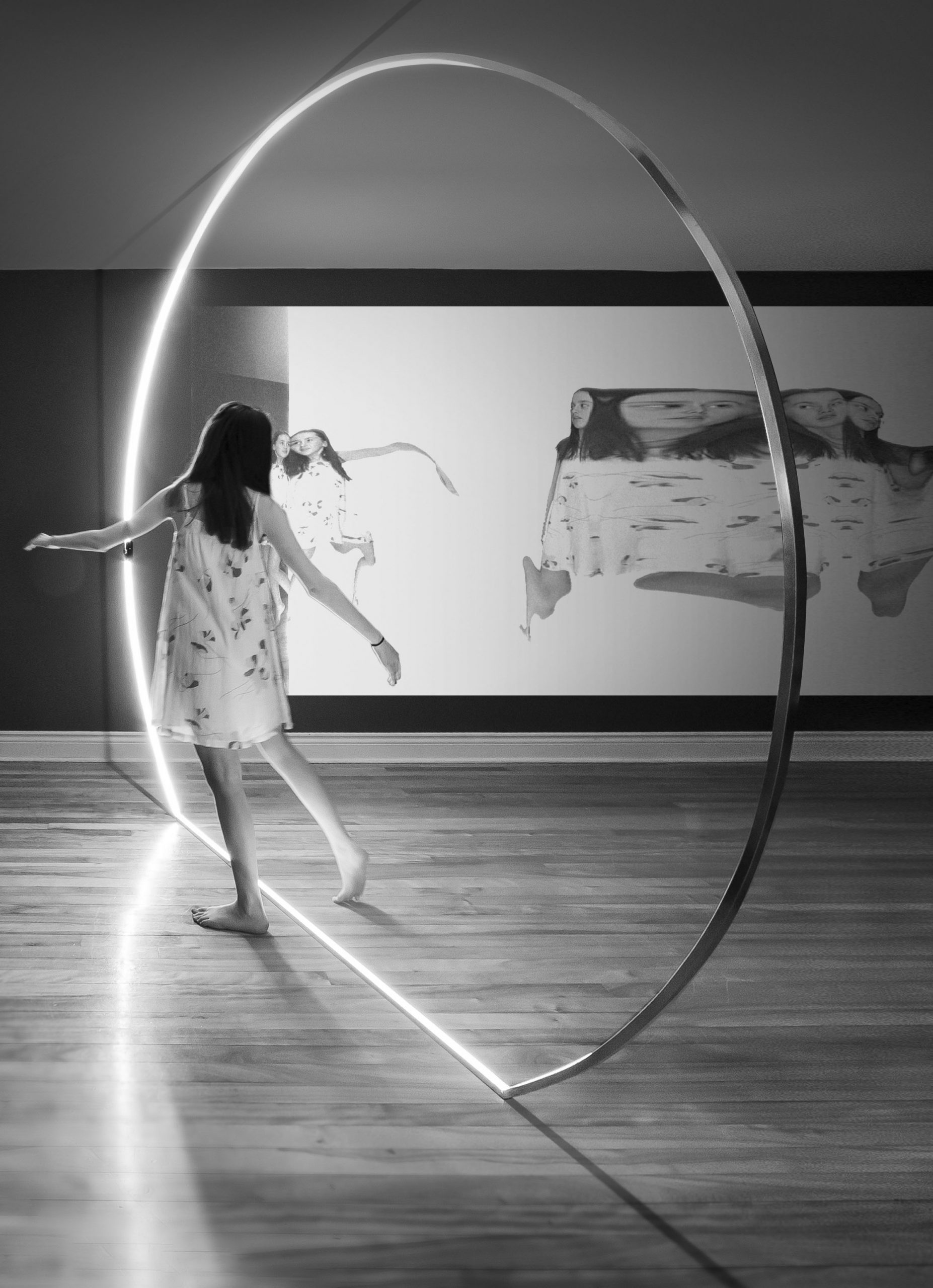 LIMINAL é uma instalação interativa que encarna a passagem inexorável do tempo. Ela busca reificar o limite entre presente e passado. Um arco de luz aparece na escuridão: é um portal temporal. Quando cruzamos esse limiar, nosso reflexo projetado na parede adjacente parece distribuído no tempo graças à técnica de slit-scan aplicada. Nessa metáfora visual – o passado constantemente substituindo o presente – vemos nossa imagem desvanecendo inexoravelmente no limbo da luz branca. De alguma forma, o trabalho enfatiza que todas as luzes são manifestações de eventos que já aconteceram – o cintilar que vemos no céu noturno não é nada além de uma fotografia passada das estrelas.