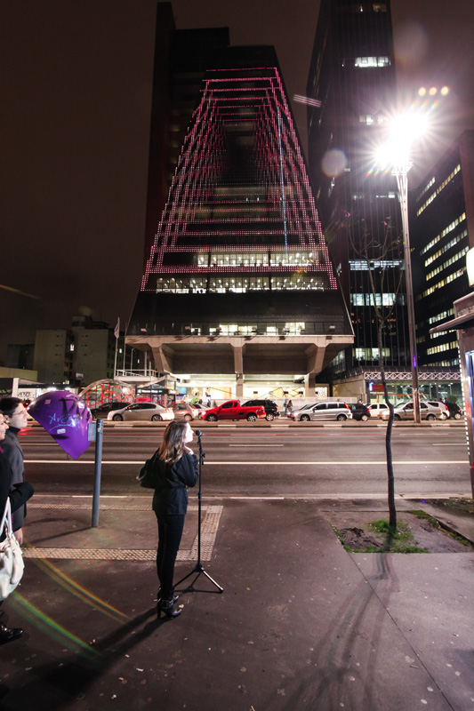 A exposição de arte-tecnologia do FILE São Paulo 2013 traz o trabalho inédito e interativo do famoso grupo 1024 architecture para ser apresentado no gigantesco painel de LED da avenida Paulista, no prédio da FIESP. As pessoas poderão modificar as imagens do painel através da sua voz ou do cantarolar de uma música.