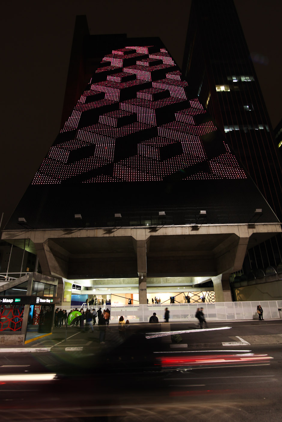 The 1024 architecture group created the “interactive LED” digital graphic project for the Paulista Avenue, which will be presented from July 22 through August 18, 2013. The project consists of a podium with a microphone installed on the sidewalk of the Paulista Avenue, where people could interact through the vocal conversion into musical notes. The 1024 architecture group elaborated a brand new algorithm for this project, which changes the graphic behaviors by means of sounds. Depending on the note sung, several parameters of the program, such as colors, shapes, density, and rhythms (squares, circles, stripes, etc.), will change.