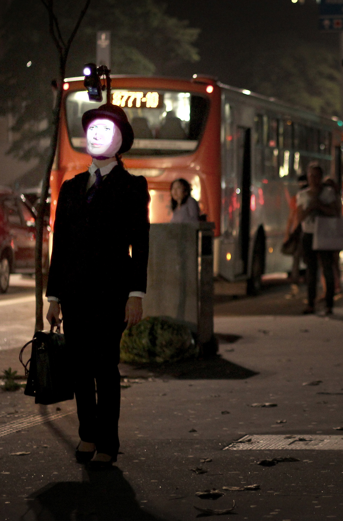 Inspirado no “Herói de mil faces”, de Joseph Campbell, “Monomito” é uma performance multimídia em que um performer cruza o espaço público vestindo um aparato que reconhece padrões visuais de rostos humanos, “sequestrando-os” e projetando-os na máscara do performer, assim como em outros lugares do espaço por onde cruza. Para a apresentação no FILE, o painel de LEDs da Galeria de Arte Digital SESI-SP, na Avenida Paulista, exibirá em tempo real as faces capturadas pelo performer, estabelecendo um diálogo entre o monumental e o mundano.