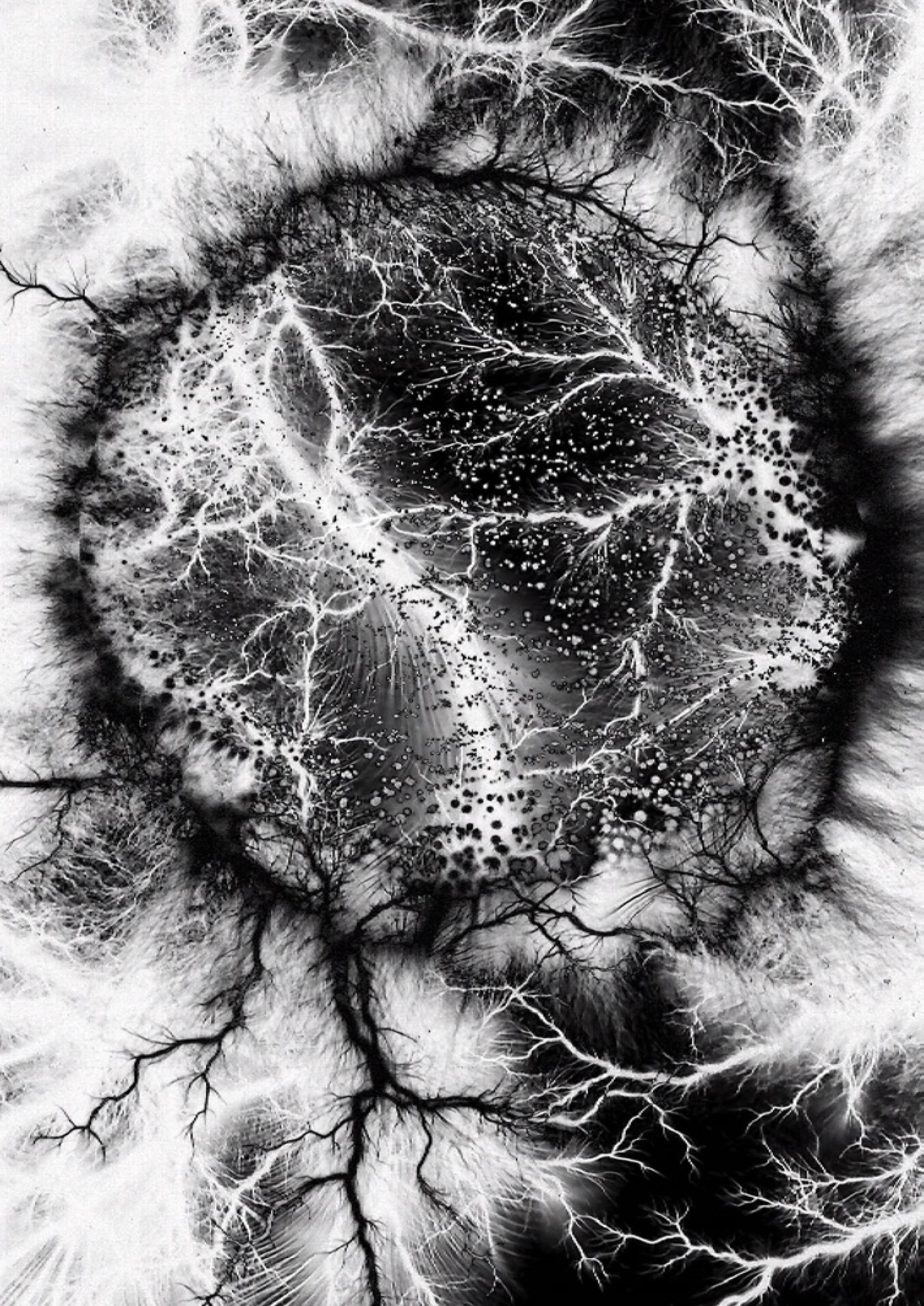 De um mero ponto de vista técnico, a tela ganha vida por um feixe controlado de elétrons no tubo de raios catódicos. Para ENERGIE!, uma descarga de alta tensão descontrolada de 30.000 volts expõe várias folhas de papel fotográfico que são organizadas para criar novos sistemas visuais de organização de elétrons.