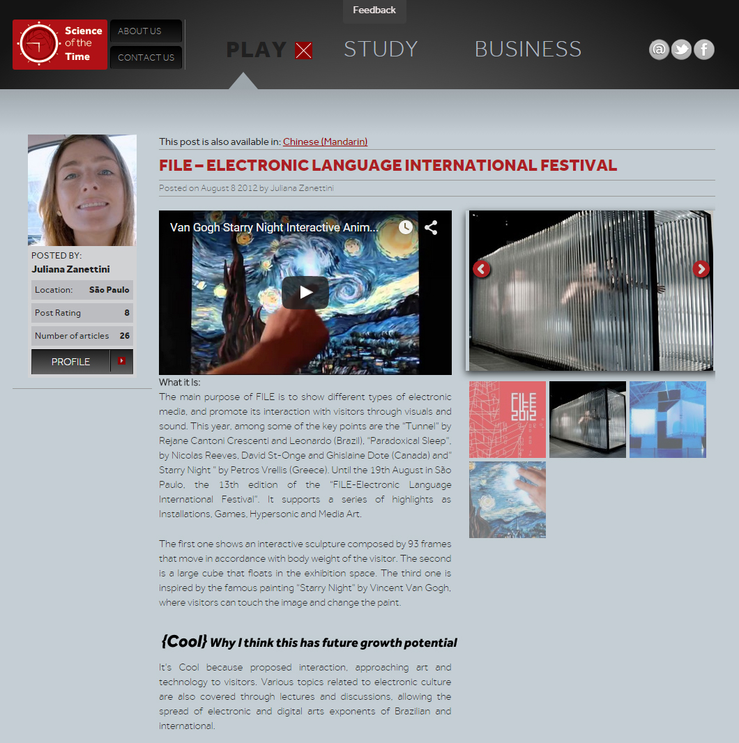 It’s Cool because proposed interaction, approaching art and technology to visitors. Various topics related to electronic culture are also covered through lectures and discussions, allowing the spread of electronic and digital arts exponents of Brazilian and international.