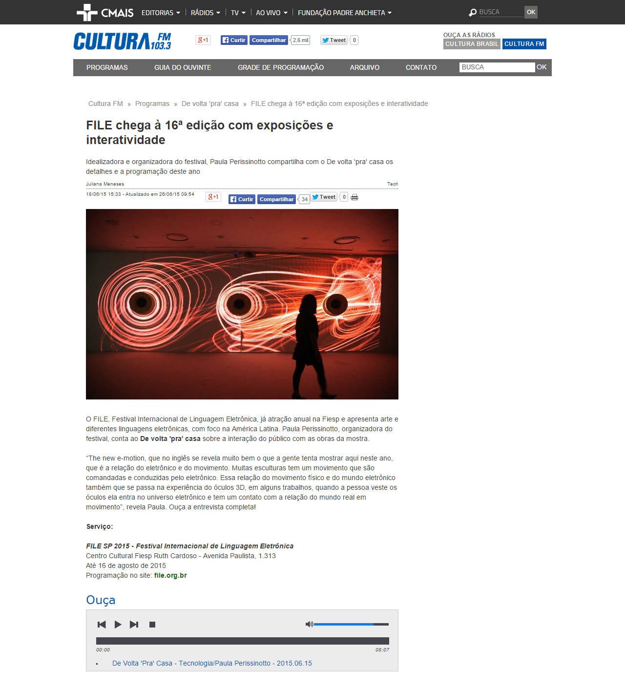 O FILE, Festival Internacional de Linguagem Eletrônica, já atração anual na Fiesp e apresenta arte e diferentes linguagens eletrônicas, com foco na América Latina. Paula Perissinotto, organizadora do festival, conta ao De volta ‘pra’ casa sobre a interação do público com as obras da mostra.
