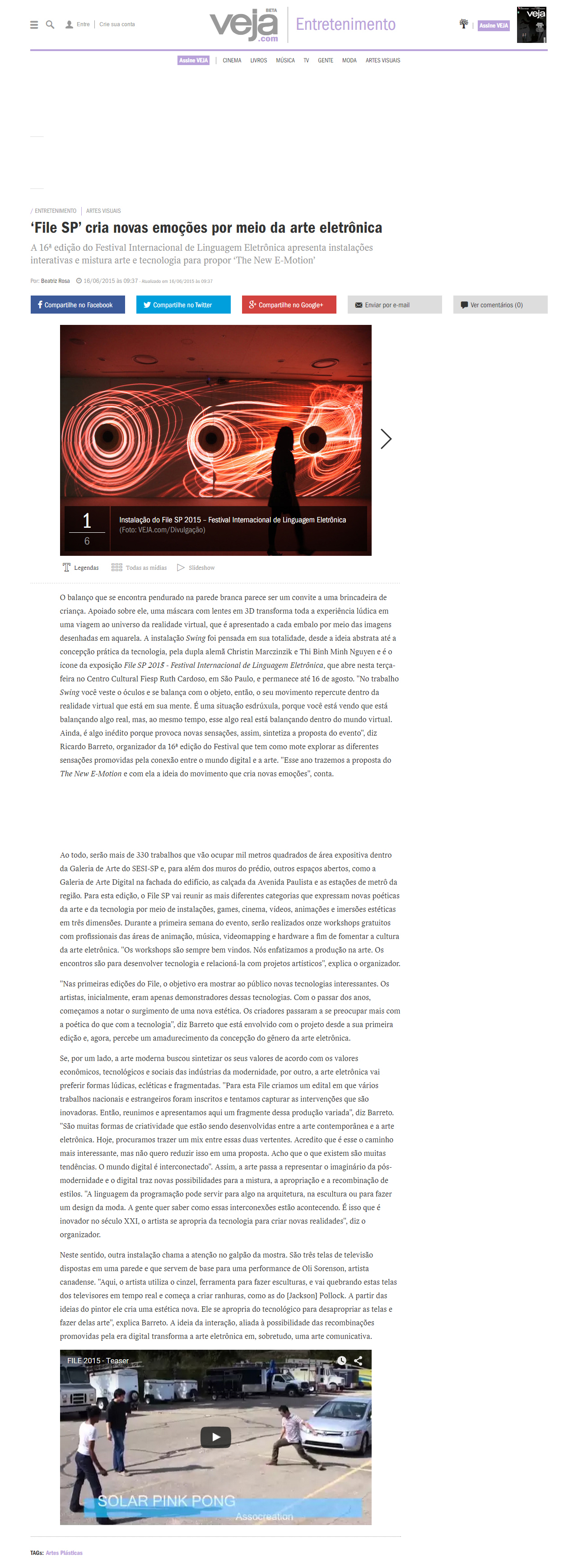 O balanço que se encontra pendurado na parede branca parece ser um convite a uma brincadeira de criança. Apoiado sobre ele, uma máscara com lentes em 3D transforma toda a experiência lúdica em uma viagem ao universo da realidade virtual, que é apresentado a cada embalo por meio das imagens desenhadas em aquarela. A instalação Swing foi pensada em sua totalidade, desde a ideia abstrata até a concepção prática da tecnologia, pela dupla alemã Christin Marczinzik e Thi Binh Minh Nguyen e é o ícone da exposição File SP 2015 – Festival Internacional de Linguagem Eletrônica, que abre nesta terça-feira no Centro Cultural Fiesp Ruth Cardoso, em São Paulo, e permanece até 16 de agosto. “No trabalho Swing você veste o óculos e se balança com o objeto, então, o seu movimento repercute dentro da realidade virtual que está em sua mente. É uma situação esdrúxula, porque você está vendo que está balançando algo real, mas, ao mesmo tempo, esse algo real está balançando dentro do mundo virtual. Ainda, é algo inédito porque provoca novas sensações, assim, sintetiza a proposta do evento”, diz Ricardo Barreto, organizador da 16ª edição do Festival que tem como mote explorar as diferentes sensações promovidas pela conexão entre o mundo digital e a arte. “Esse ano trazemos a proposta do The New E-Motion e com ela a ideia do movimento que cria novas emoções”, conta.