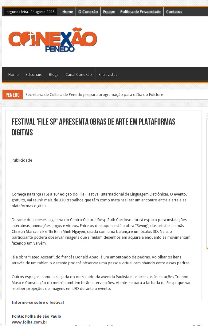 Começa na terça (16) a 16ª edição do File (Festival Internacional de Linguagem Eletrônica). O evento, gratuito, vai reunir mais de 330 trabalhos que têm como meta realizar um encontro entre a arte e as plataformas digitais.