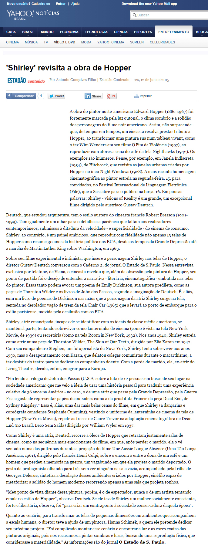 Sobre seu filme experimental e intimista, que insere a personagem Shirley nas telas de Hopper, o diretor Gustav Deutsch conversou com o Caderno 2, do jornal O Estado de S.Paulo. Nessa entrevista exclusiva por telefone, de Viena, o cineasta revelou que, além da obsessão pela pintura de Hopper, seu ponto de partida foi o desejo de entender a narrativa – literária, cinematográfica – embutida nas telas do pintor. Essas tanto podem evocar um poema de Emily Dickinson, sua autora predileta, como as peças de Thornton Wilder e os livros de John dos Passos, segundo a imaginação de Deutsch. É, aliás, com um livro de poemas de Dickinson nas mãos que a personagem da atriz Shirley surge na tela, sentada no desolador vagão de trem da tela Chair Car (1965) que a levará ao porto de embarque para o exílio parisiense, movida pela desilusão com os EUA.