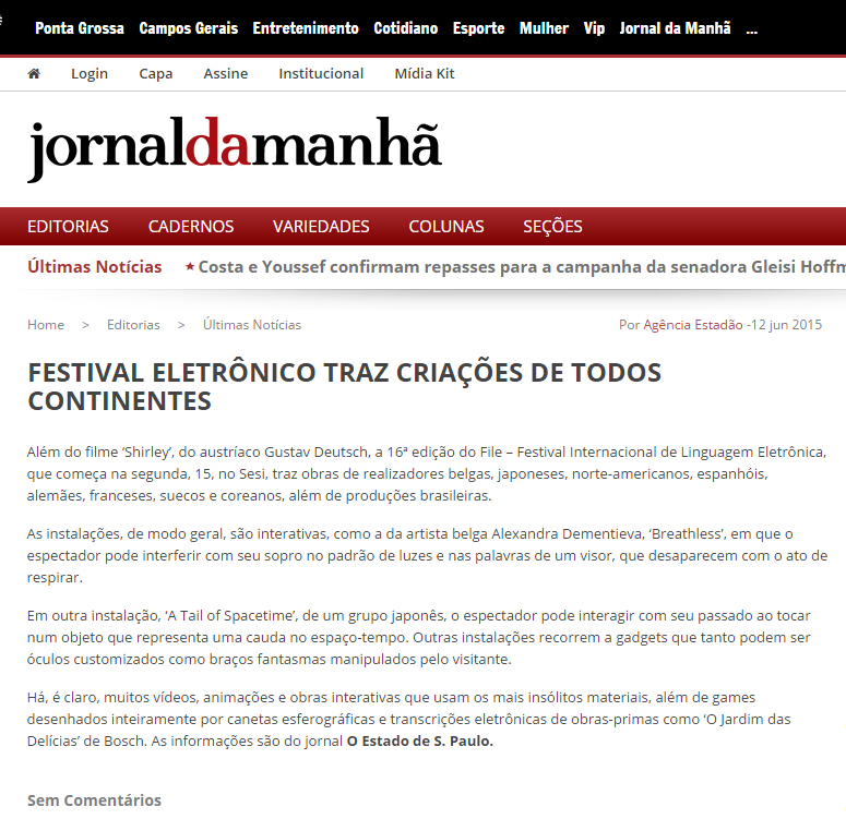 Em outra instalação, ‘A Tail of Spacetime’, de um grupo japonês, o espectador pode interagir com seu passado ao tocar num objeto que representa uma cauda no espaço-tempo. Outras instalações recorrem a gadgets que tanto podem ser óculos customizados como braços fantasmas manipulados pelo visitante.