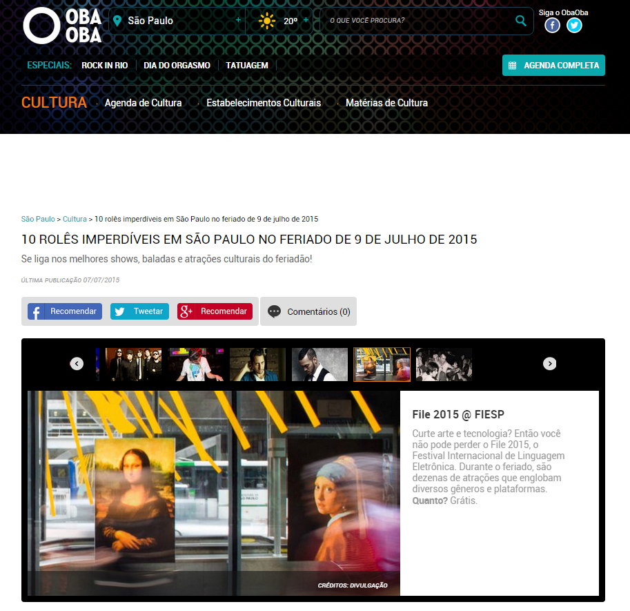 Curte arte e tecnologia? Então você não pode perder o File 2015, o Festival Internacional de Linguagem Eletrônica. Durante o feriado, são dezenas de atrações que englobam diversos gêneros e plataformas. Quanto? Grátis.