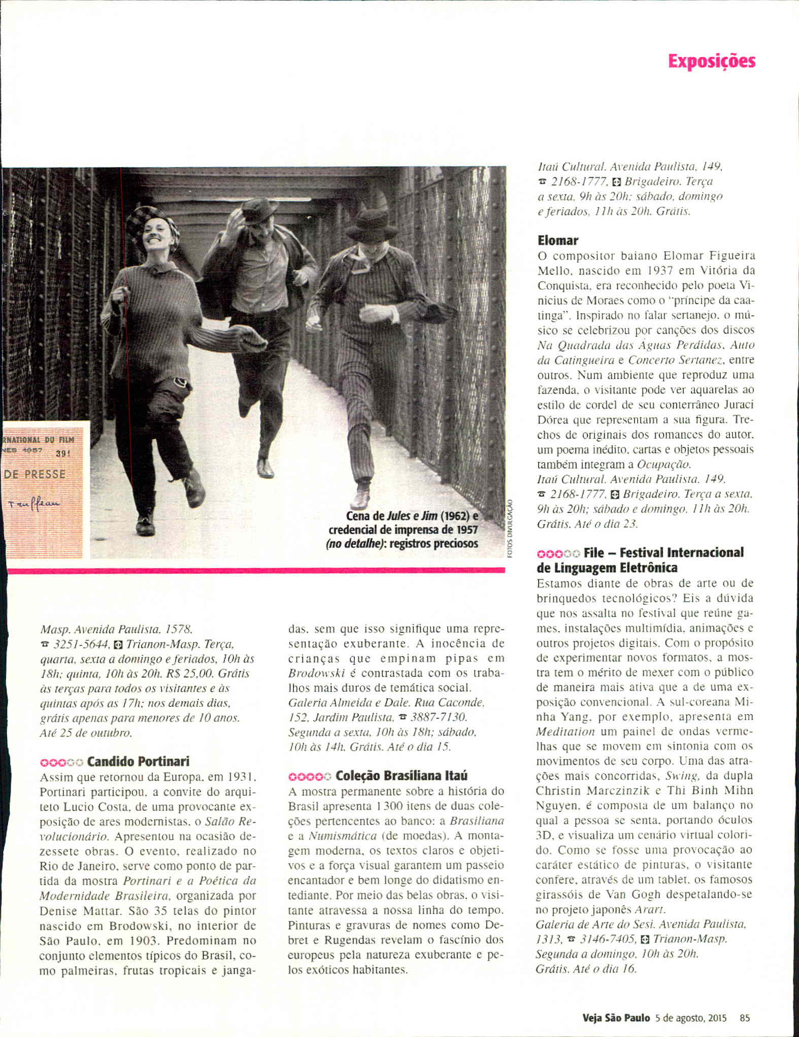 Estamos diante de obras de arte ou de brinquedos tecnológicos? Eis a dúvida que nos assalta no festival que reúne games, instalações multimídia, animações e outros projetos digitais. Com o propósito de experimentar novos formatos. a mostra tem o mérito de mexer com o público de maneira mais ativa que a de uma exposiçâo convencional. A sul-coreana Minha Yang. por exemplo, apresenta em Meditation um painel de ondas vermelhas que se movem cm sintonia com os movimentos de seu corpo. Urna das atrações mais concorridas, Swing, da dupla Christin Marczinzik e Thi Binh Mihn Nguyen, é composta de um balanço no qual a pessoa se senta, portando óculos 3D, e visualiza um cenário virtual colorido. Como se fosse uma provocaçáo ao caráter estático de pinturas, o visitante confere, através de um tablet, os famosos girassóis de Van Gogh despetalando-se no projeto japonês Arart. Galeria de Arte do Sesi. Avenida Paulista, 1313.