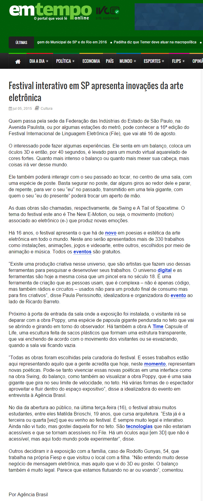 “Todas as obras foram escolhidas pela curadoria do festival. E esses trabalhos estão aqui representando aquilo que a gente acredita que hoje, neste momento, representam novas poéticas. Pode-se tanto vivenciar essas novas poéticas em uma interface como na obra Swing, do balanço, como também ao visualizar a obra Poppy, que é uma saia gigante que gira no seu limite de velocidade, no teto. Há várias formas de o espectador aproveitar e fluir dentro do espaço expositivo”, disse a idealizadora do evento em entrevista à Agência Brasil.