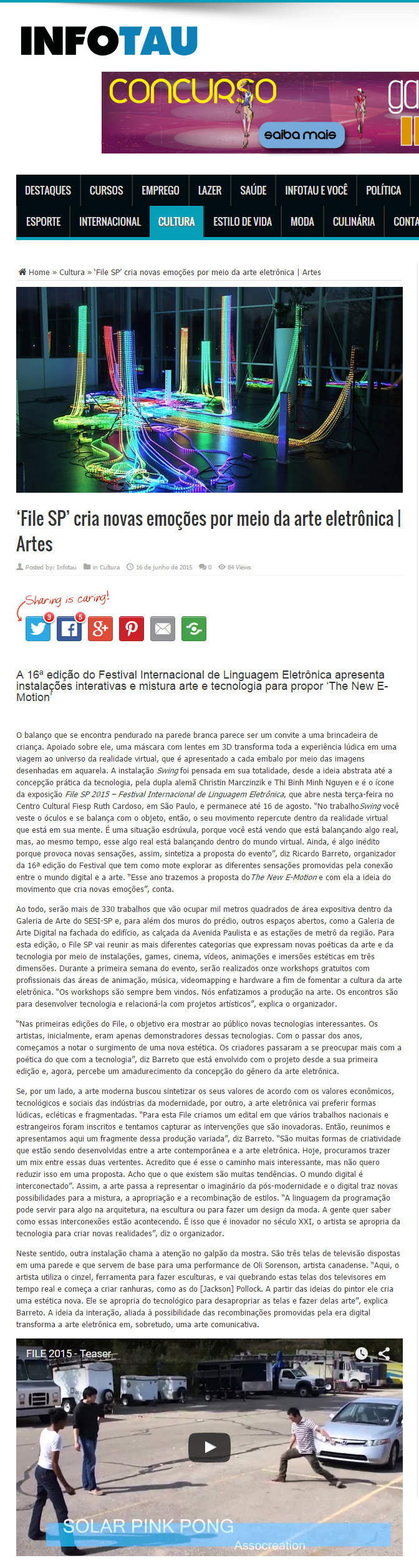 O balanço que se encontra pendurado na parede branca parece ser um convite a uma brincadeira de criança. Apoiado sobre ele, uma máscara com lentes em 3D transforma toda a experiência lúdica em uma viagem ao universo da realidade virtual, que é apresentado a cada embalo por meio das imagens desenhadas em aquarela. A instalação Swing foi pensada em sua totalidade, desde a ideia abstrata até a concepção prática da tecnologia, pela dupla alemã Christin Marczinzik e Thi Binh Minh Nguyen e é o ícone da exposição File SP 2015 – Festival Internacional de Linguagem Eletrônica, que abre nesta terça-feira no Centro Cultural Fiesp Ruth Cardoso, em São Paulo, e permanece até 16 de agosto. “No trabalhoSwing você veste o óculos e se balança com o objeto, então, o seu movimento repercute dentro da realidade virtual que está em sua mente. É uma situação esdrúxula, porque você está vendo que está balançando algo real, mas, ao mesmo tempo, esse algo real está balançando dentro do mundo virtual. Ainda, é algo inédito porque provoca novas sensações, assim, sintetiza a proposta do evento”, diz Ricardo Barreto, organizador da 16ª edição do Festival que tem como mote explorar as diferentes sensações promovidas pela conexão entre o mundo digital e a arte. “Esse ano trazemos a proposta doThe New E-Motion e com ela a ideia do movimento que cria novas emoções”, conta.