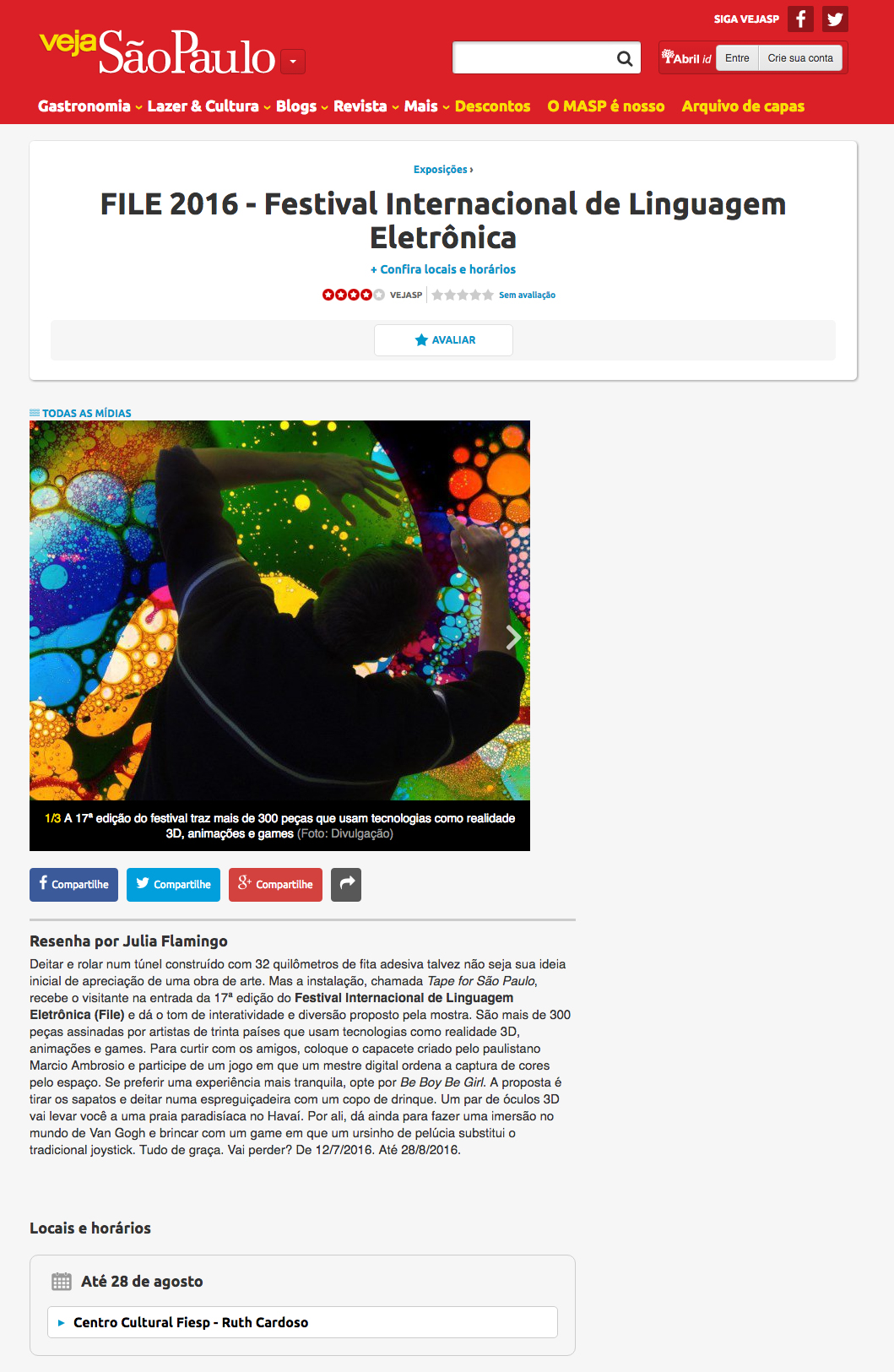 Deitar e rolar num túnel construído com 32 quilômetros de fita adesiva talvez não seja sua ideia inicial de apreciação de uma obra de arte. Mas a instalação, chamada Tape for São Paulo, recebe o visitante na entrada da 17ª edição do Festival Internacional de Linguagem Eletrônica (File) e dá o tom de interatividade e diversão proposto pela mostra. São mais de 300 peças assinadas por artistas de trinta países que usam tecnologias como realidade 3D, animações e games. Para curtir com os amigos, coloque o capacete criado pelo paulistano Marcio Ambrosio e participe de um jogo em que um mestre digital ordena a captura de cores pelo espaço. Se preferir uma experiência mais tranquila, opte por Be Boy Be Girl. A proposta é tirar os sapatos e deitar numa espreguiçadeira com um copo de drinque. Um par de óculos 3D vai levar você a uma praia paradisíaca no Havaí. Por ali, dá ainda para fazer uma imersão no mundo de Van Gogh e brincar com um game em que um ursinho de pelúcia substitui o tradicional joystick. Tudo de graça. Vai perder? De 12/7/2016. Até 28/8/2016.