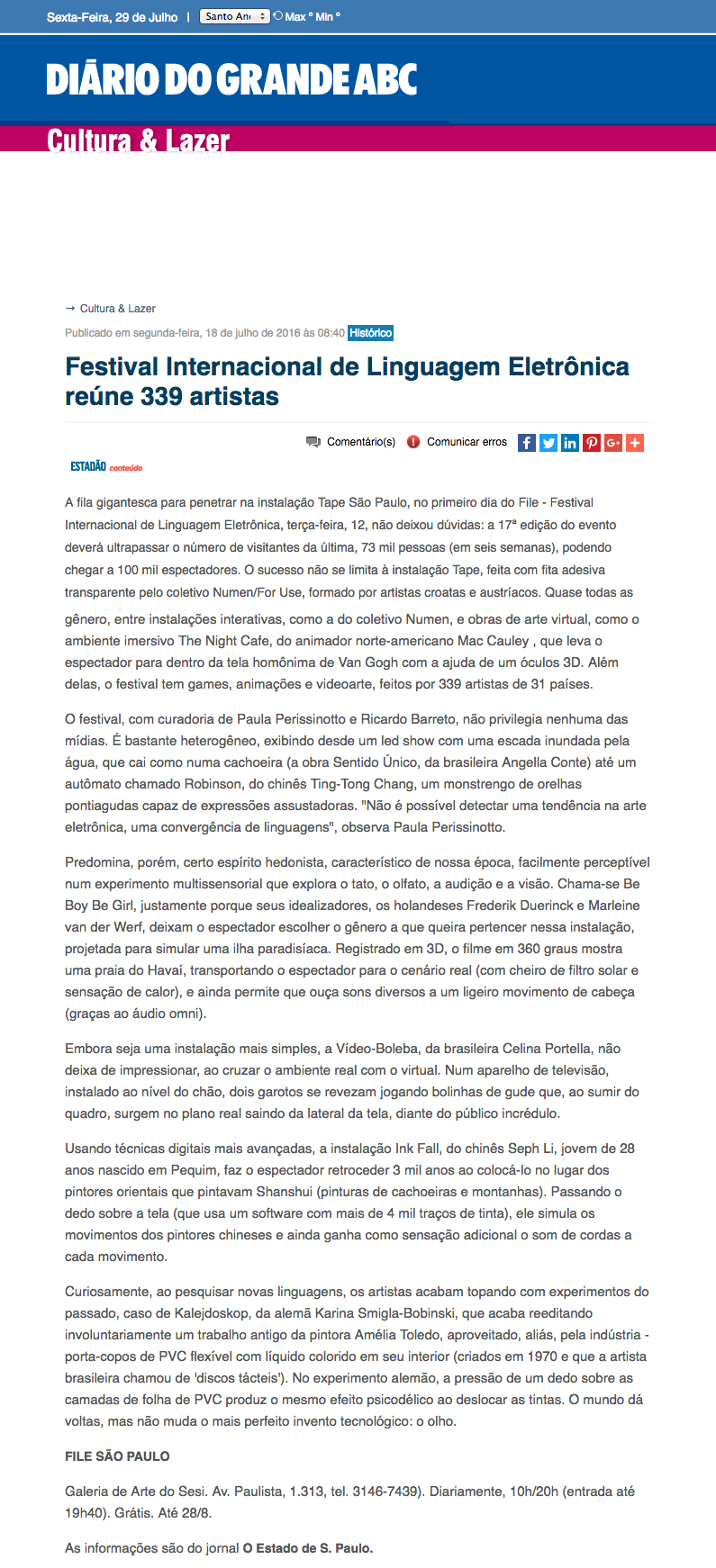A fila gigantesca para penetrar na instalação Tape São Paulo, no primeiro dia do File – Festival Internacional de Linguagem Eletrônica, terça-feira, 12, não deixou dúvidas: a 17ª edição do evento deverá ultrapassar o número de visitantes da última, 73 mil pessoas (em seis semanas), podendo chegar a 100 mil espectadores. O sucesso não se limita à instalação Tape, feita com fita adesiva transparente pelo coletivo Numen/For Use, formado por artistas croatas e austríacos. Quase todas as obras do festival são interativas.