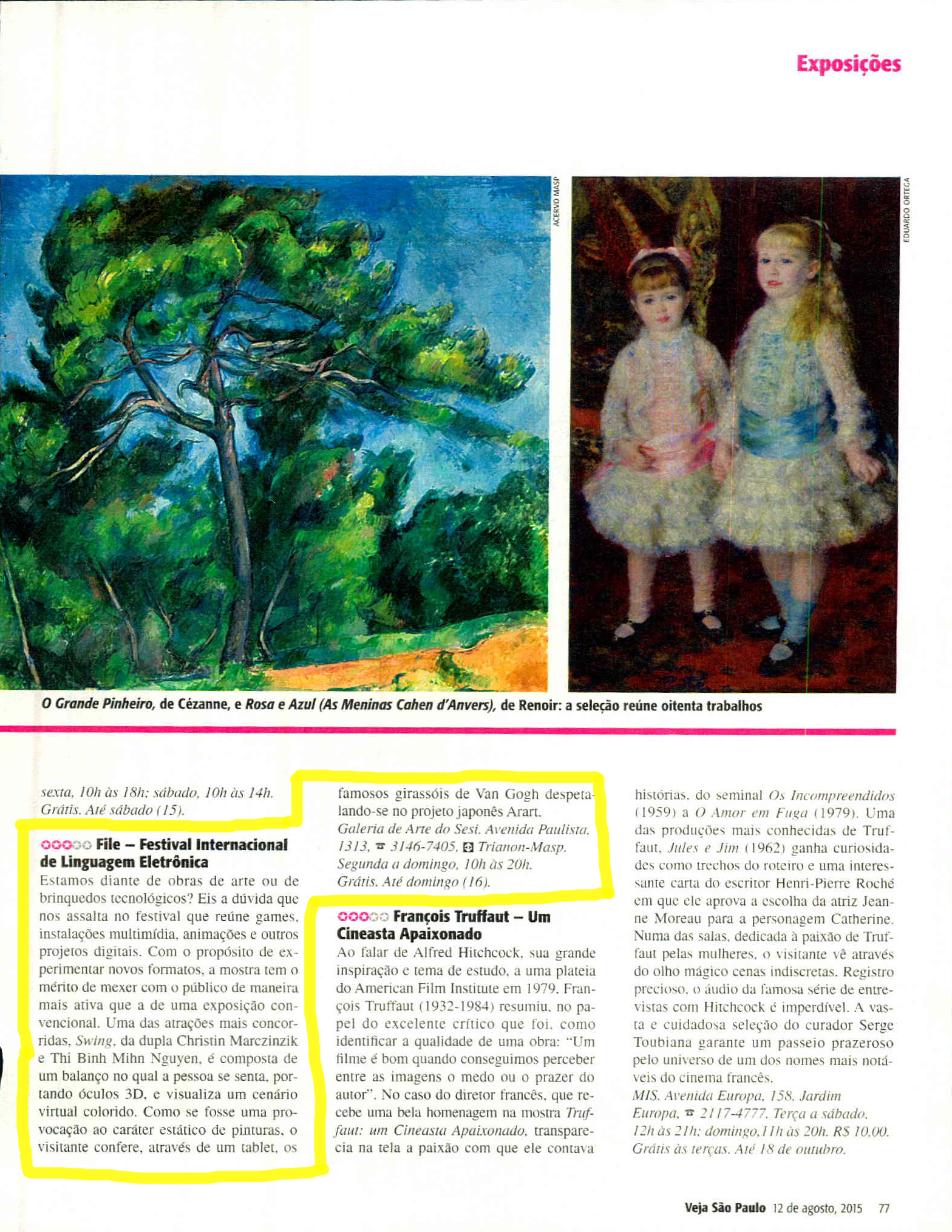 Tecnologia | Segunda é uma boa oportunidade para visitar a 17ª edição do Festival Internacional de Linguagem Eletrônica (FILE), em cartaz no edifício da Fiesp. A mostra, que segue até o dia 28/8, reúne cerca de 330 trabalhos que utilizam a tecnologia como suporte. A entrada é gratuita.