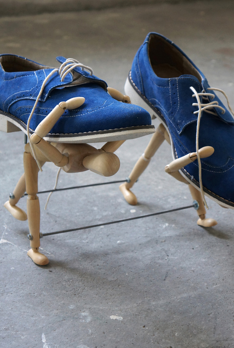 Em “Down to Earth”, Anna Vasof se refere à importância multifuncional de sapatos, ao mesmo tempo em que torce de forma muito particular o conceito de calçado. A artista fabricou artifícios mecânicos altamente distintos para cada um de seus 28 designs de sapato. Alguns deles criam histórias inteiras ao caminharem. Há, por exemplo, um garfo que, em vão, tenta espetar uma azeitona e um martelo que bate na lateral direita do sapato a cada passo.