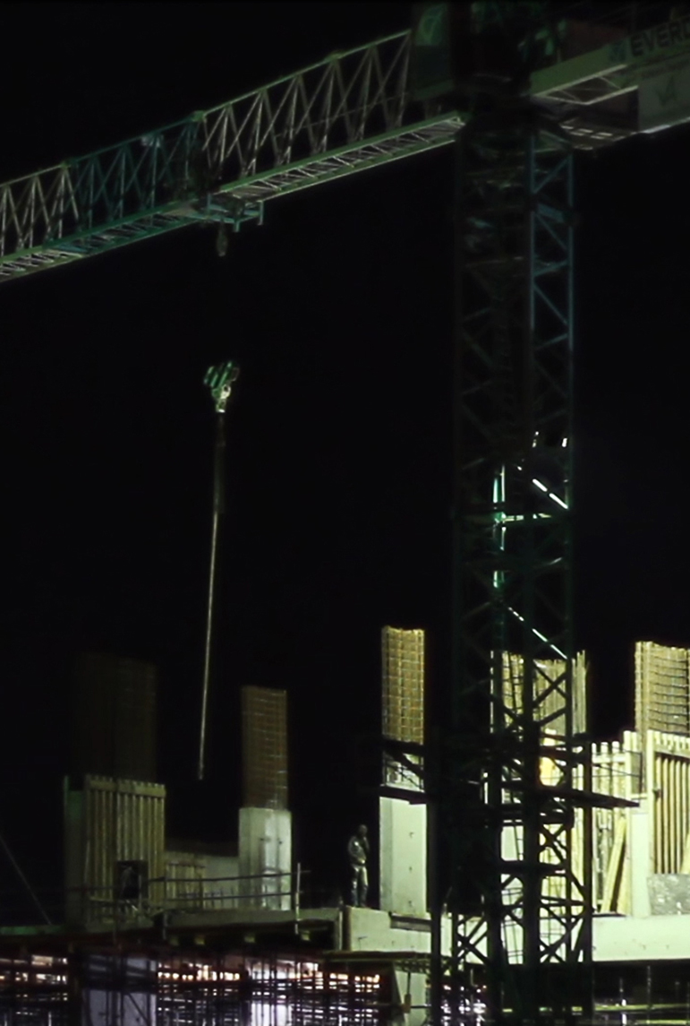 O prédio em construção expõe seu esqueleto de aço na escuridão, e nós enxergamos os trabalhadores. Na voz de Maria Callas, o prédio, decorado com luzes coloridas, parece um palco lindamente projetado. Os movimentos dos trabalhadores completam a cuidadosa mise-em-scène.