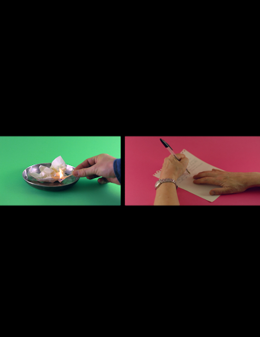 Quatro indivíduos e seus lápis atingem uma catarse preparando uma carta para um leitor ausente e liberando todos os tipos de lembranças. Contidos em um vídeo, cada folha amarrotada que é observada torna-se ilegível. Lentamente, o fogo consome o sinal da catarse: lembranças traduzidas em linhas são oferecidas como simples cinzas.