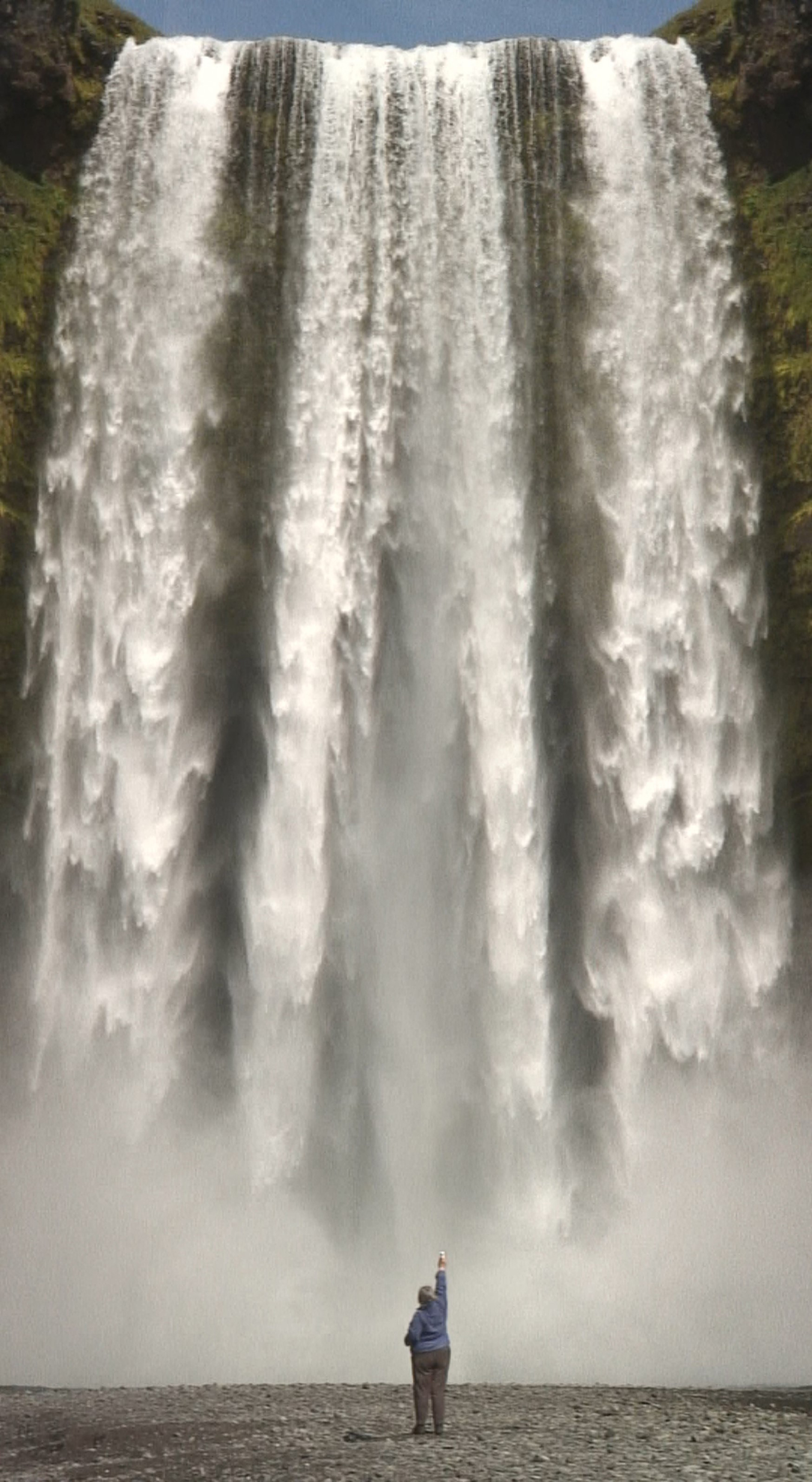 “Waterfall” apresenta ao público uma imagem simples e estática de uma cachoeira majestosa. Ao longo da peça, uma quantidade de pequenas figuras caminha lentamente para a imagem. Eles vieram prestar homenagens à cachoeira e podemos chamá-los de peregrinos – podemos chamá-los de turistas.