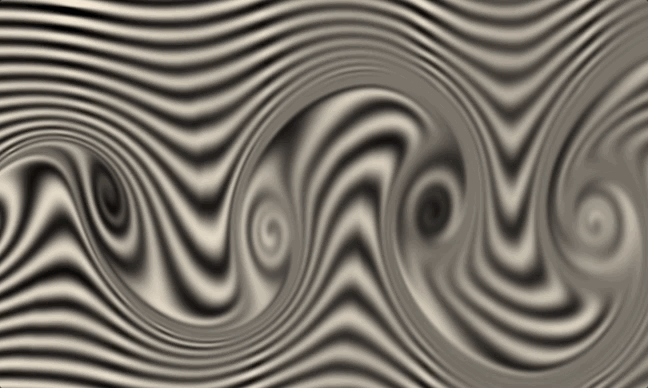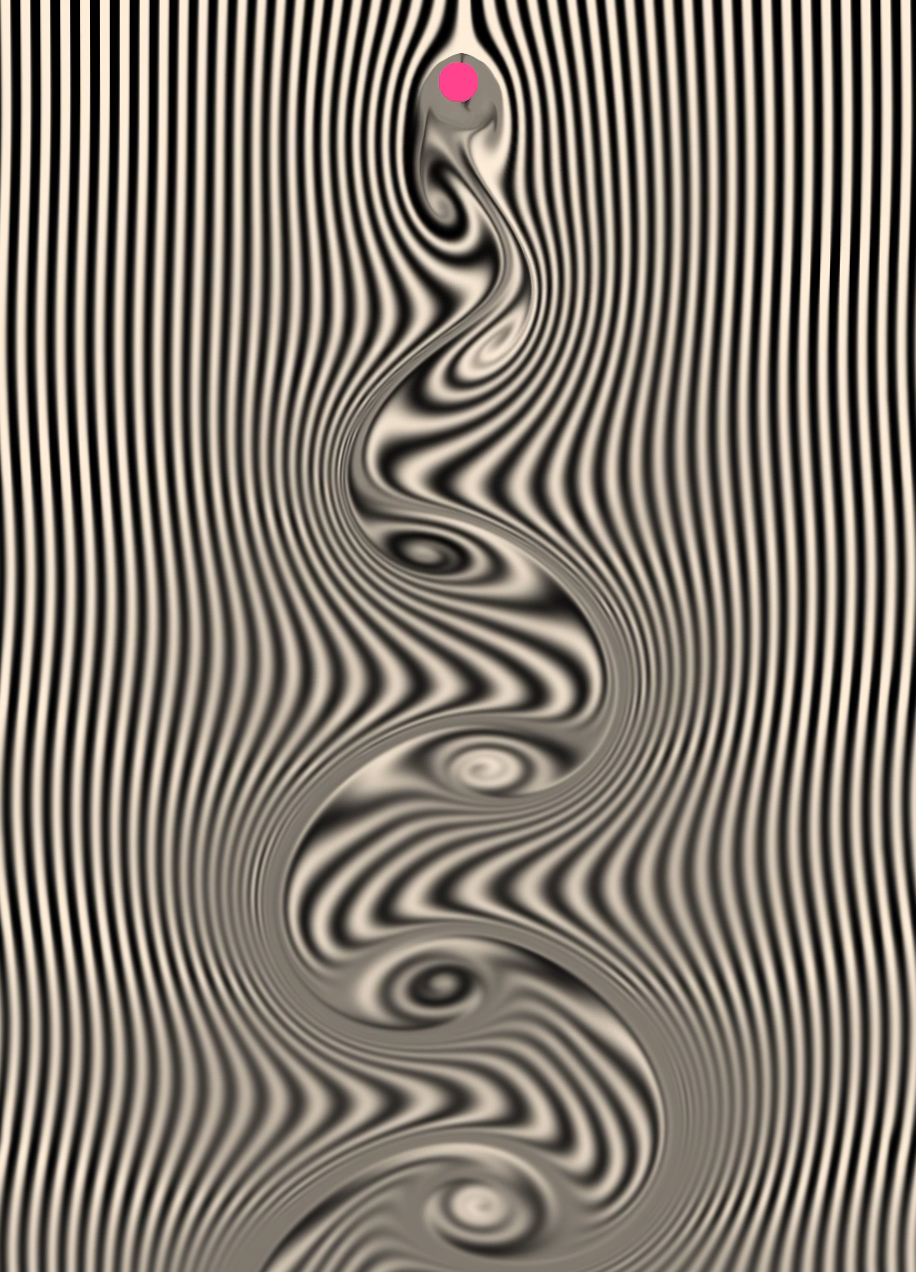 Esta simulação resolve as equações de Navier-Stokes para um fluxo de fluido incompressível, passando por um obstáculo circular em um shader de fragmento de GPU. Exibe um fenômeno chamado queda de vórtice, onde vórtices de rotação alternada surgem espontaneamente por trás do obstáculo.
